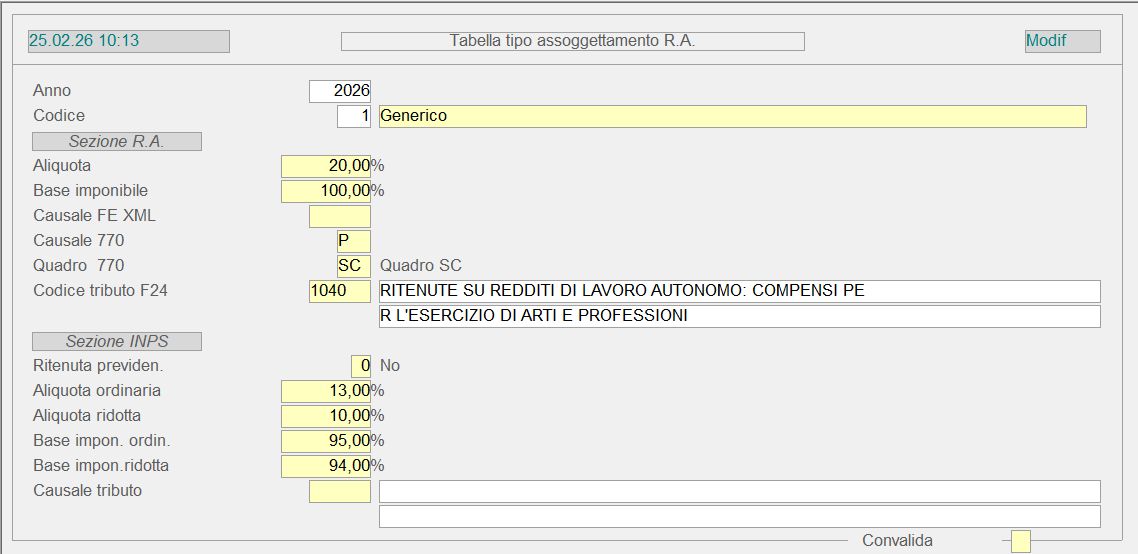 Questa tabella, gestita per anno contabile, include i tipi di assoggettamento alla ritenuta d'acconto, utili per la gestione dei Compensi a Terzi e per la dichiarazione dei sostituti d'imposta (Modello 770). Entrambi i moduli sono perfettamente integrabili con la Contabilità Generale.