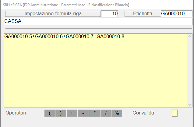 L'impostazione della Formula (TCol da 20 a 25) avviene in un'apposita window in cui l'Utente deve indicare la colonna o le colonne interessate nel formato LABEL.colonna e può utilizzare gli operatori visualizzati nella parte inferiore della window.