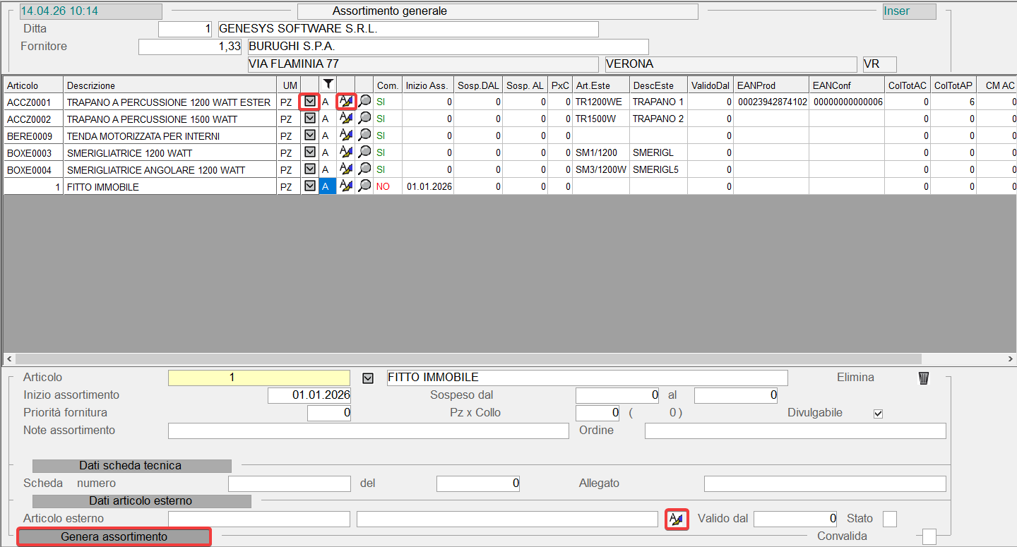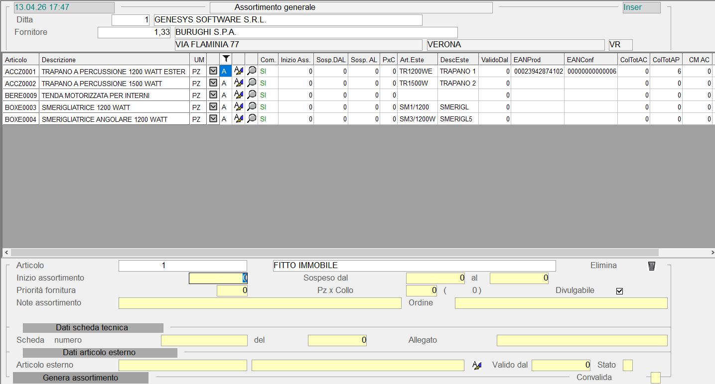 Questa funzione è dedicata alla gestione delle referenze (prodotti) per Fornitore: operativamente, l'Utente deve indicare il periodo di Validità dell'Assortimento, che sarà utilizzato come controllo in fase d'immissione Ordini e Documenti Acquisto; è possibile prevedere anche un periodo di Sospensione, durante il quale Non sarà consentita la fornitura degli Articoli in Assortimento.