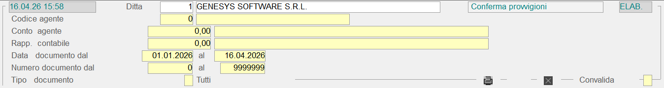 Prima di procedere alla fase di Conferma Provvigioni, impostare opportunamente i parametri di filtro nell'apposita videata: