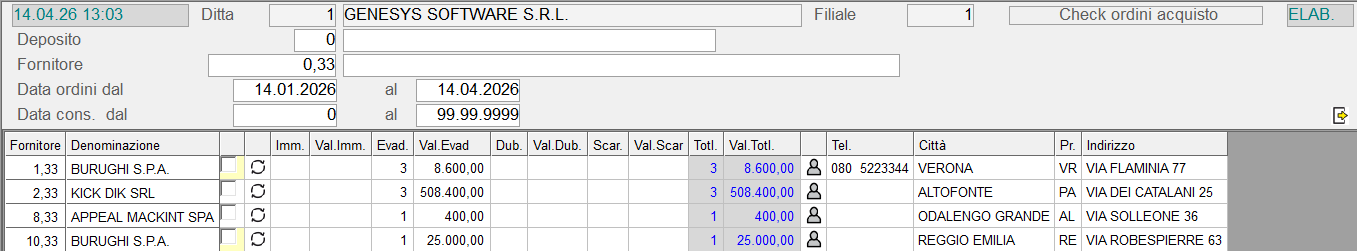 Il programma visualizza in un data-grid l'elenco dei Fornitori a cui risultano intestati Ordini di Acquisto Non ancora evasi e che corrispondono ai parametri impostati.
