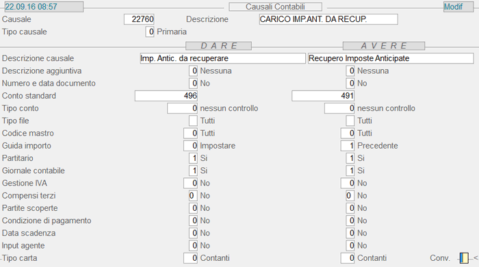 Causale 22.760 - Carico Imposte Anticipate da Recuperare
